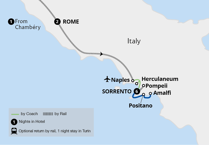 Uncover the beauty of one of Europe's most enchanting regions, the captivating Amalfi Coast. The journey begins with two nights in the 'Eternal City' of Rome, where ancient landmarks and vibrant culture set the stage. From here, continue to the charming clifftop town of Sorrento, overlooking the glittering bay of Naples, the gateway to Capri and...