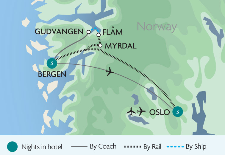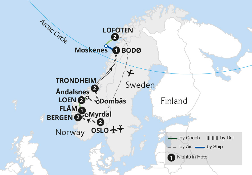 Join us on a summertime journey across the length of Norway - from Oslo to the Arctic Circle. Travel on four of the country's world-renowned rail routes, the Flåm, Bergen, Nordland and Rauma railways and cruise across the Geirangerfjord, discovering otherworldly landscapes. On this top-rated tour of Norway's beautiful cities and the arctic...