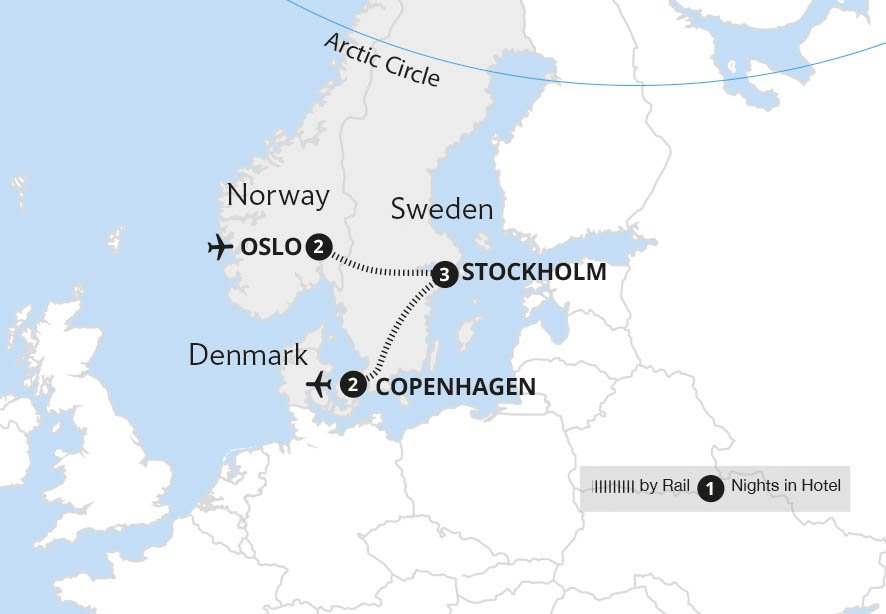 Discover evocative Scandinavian landscapes on picturesque rail journeys, between the cultured capitals of Norway, Sweden and Denmark. Starting in Oslo, uncover its stylish modernity and thousand-year history on a guided tour, before travelling by rail to majestic Stockholm. In the Swedish capital we visit the tiny Old Town, Gamla Stan, one of the...