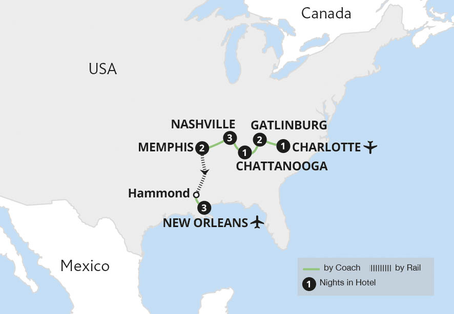 • Explore Nashville, Memphis and New Orleans, staying in 3 & 4-Star hotels