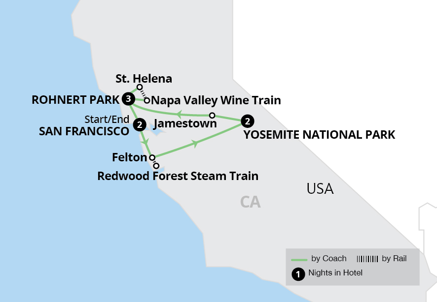 California is a land of possibilities, and this unforgettable tour showcases some of its greatest offerings. Soak up the modern and historic sides of San Francisco and travel into nature, where towering redwood trees surround us on the Redwood Forest steam train. Then, admire the mountain and waterfall panoramas of Yosemite National Park before...
