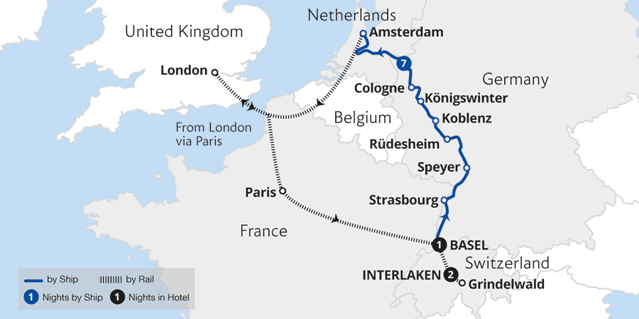 Enjoy one of the world's finest rail journeys aboard the legendary Glacier Express to Zermatt and admire Matterhorn views from the charming Gornergrat Railway. Descending the Alps, set sail on a sensational Rhine cruise, indulging in luxurious amenities and superb service. Enroute, savour incredible vistas of the stunning Rhine Gorge.