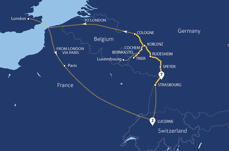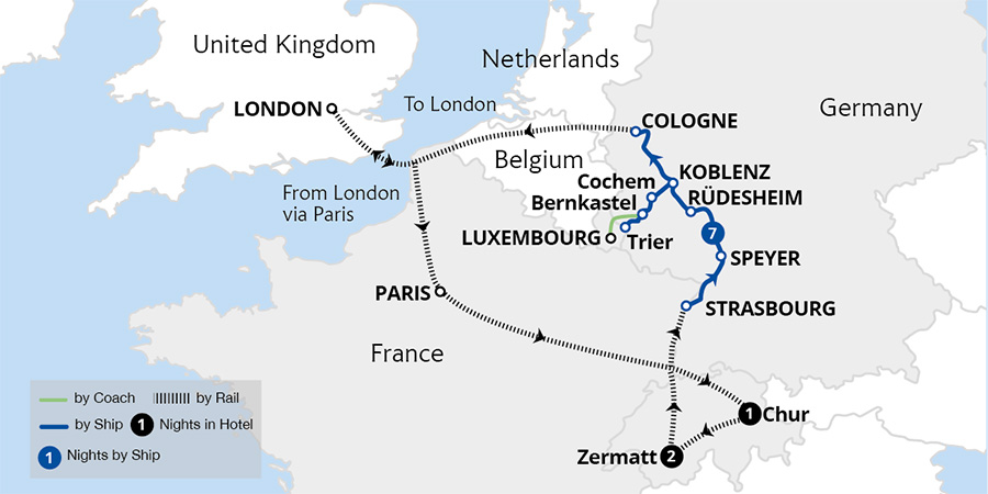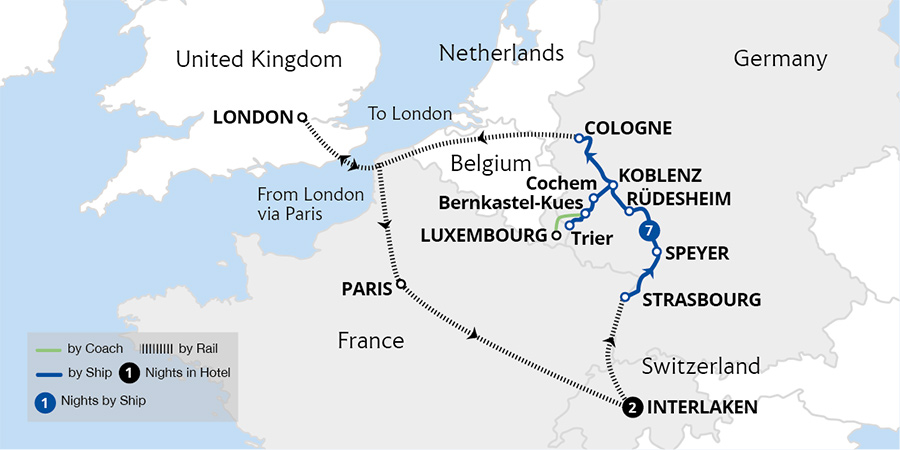 Combine an iconic rail trip on the Jungfrau Railway to the 'Top of Europe' from the alpine resort town of Interlaken with a 7-night luxury cruise through the glorious Moselle and Rhine. From Interlaken's stunning lake and mountain setting, we board the MS Amadeus Cara, and cruise two of Europe's celebrated rivers - the meandering Moselle...