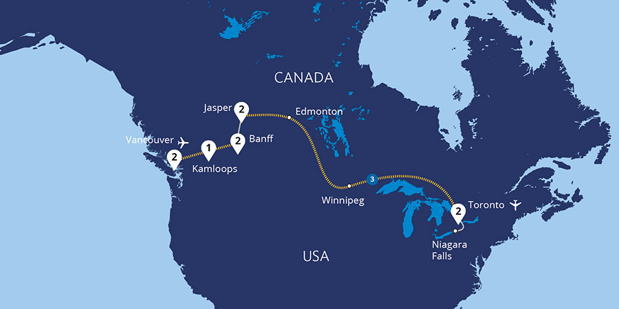 Uncover Canada's most amazing landscapes on this journey from the Pacific coast to the Great Lakes. Our exploration begins with a guided tour of Vancouver before touring the stunning Rocky Mountains from the mountain town of Jasper. Here, we admire awe-inspiring vistas including the Maligne River valley. An epic three-night journey from...