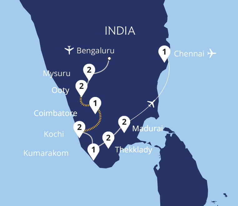 This unforgettable tour of colourful southern India explores vibrant cities, stunning Hindu temples, atmospheric mountain plantations and tranquil backwaters. From historic Mysuru's awe-inspiring royal palace, we soak up the charms of botanic Ooty and the tea plantations of Coonoor on the delightful Nilgiri Mountain Railway. Arriving on...