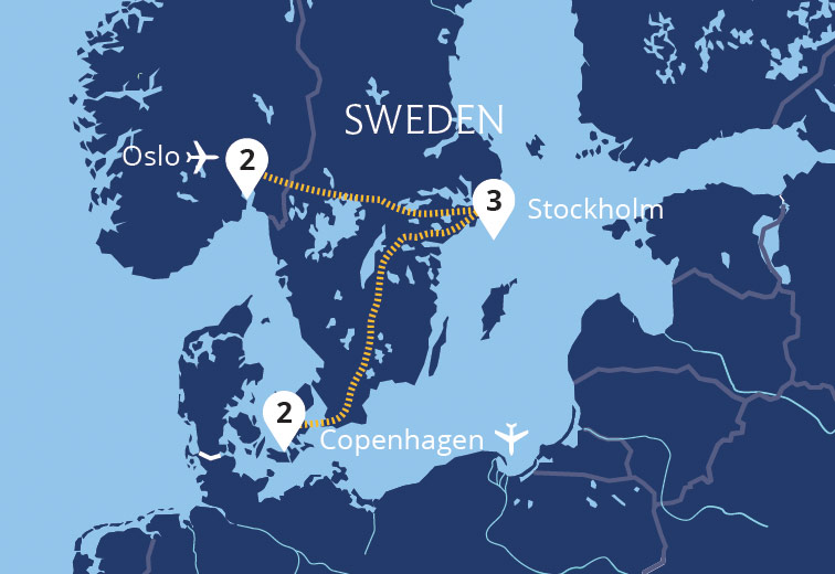 Travel by rail through evocative Scandinavian landscapes to the capitals of Norway, Sweden and Denmark. Begin by uncovering Oslo's stylish modernity as well as its long and varied history on a guided tour, before travelling by rail to Stockholm. In the Swedish capital, visit picturesque Gamla Stan, one of the best-preserved medieval centres in...
