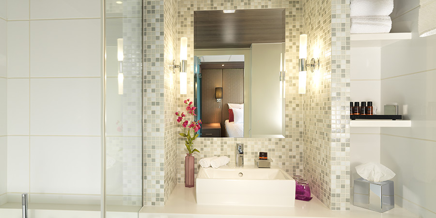 These en-suite cabins are stylish and impressively spacious at 17.5 squre metres, with a panoramic window balcony, walk-in wardrobe and seating area.