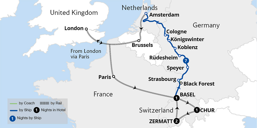 Your holiday begins this morning as we meet at London St Pancras before boarding the Eurostar to Paris. From the French capital, we continue by rail to Basel.