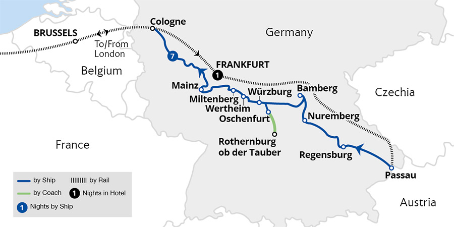 Your holiday begins as we meet at London St Pancras to begin our journey. We ride the Eurostar to Brussels, then continue by rail to Frankfurt, the financial capital of Germany, where we spend our first night. This city is renowned for its Romerplatz, an old trading square where merchants used to sell their goods. During our first dinner together at the hotel, we look forward to the upcoming experiences ahead on our cruise.