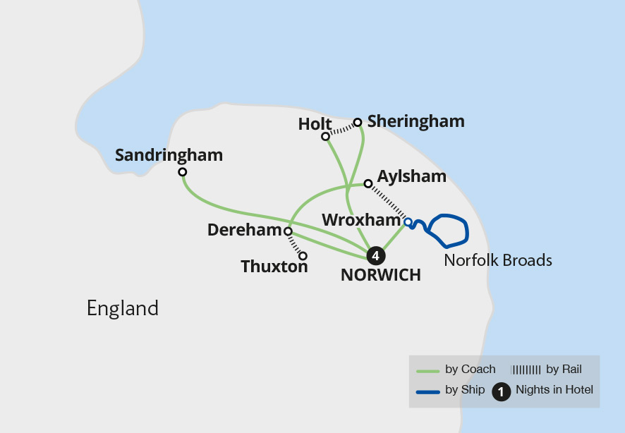 Discover the rich heritage and natural beauty of Norfolk and Norwich on a journey filled with historic railways, waterways and royal charm. Explore the medieval city of Norwich on a guided tour, cruise along the Norfolk Broads on a Mississippi paddle boat and step back in time on scenic journeys with the Mid and North Norfolk railways. We also...