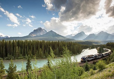 Famous for its stunning views of the mountains near Lake Louise, Morant's Curve is one of the most iconic and picturesque locations in the Canadian Rockies. The dramatic bend along the Bow River is a photographer's dream, offering the perfect shot of Rocky Mountaineer as its winds gracefully through the spectacular alpine scenery.